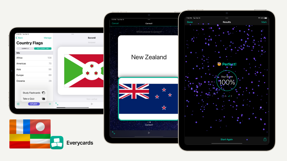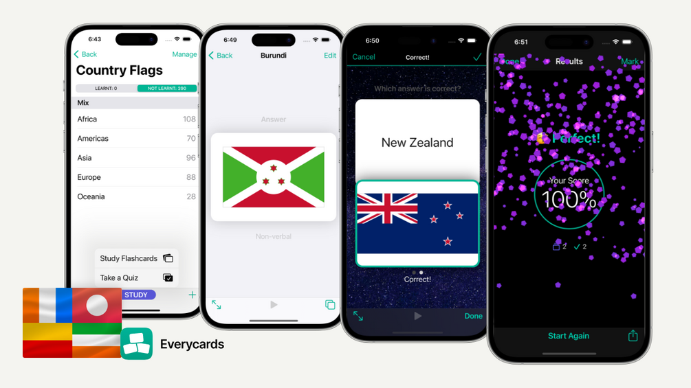 You can study flashcards in both directions: Country → Flag and Flag → Country.