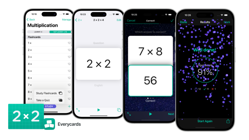 These digital flashcards and quizzes will help you memorise the multiplication tables* — a fundamental building block in the vast fields of mathematics and science.